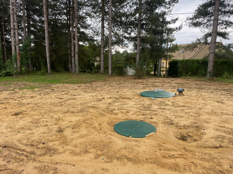 Aigné (72) - création d'un assainissement autonome par l'équipe de regard'o. Mise en oeuvre d'un filtre compacte agréé pour 8EH. Ici, pas besoin de poste de relevage, le dénivelé du terrain nous a permis un rejet au fossé des eaux traitées par gravité.